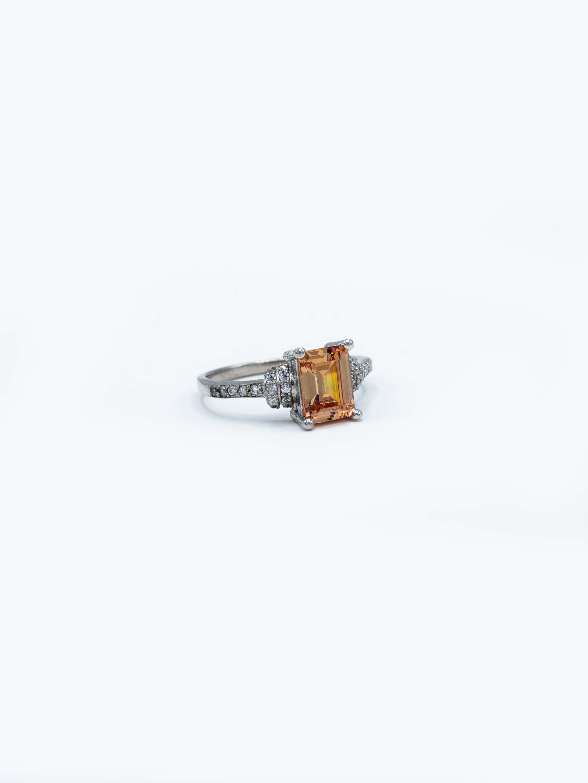 طراحی این انگشتر تنها به نگین مرکزی محدود نمی‌شود؛ رکاب انگشتر در دو طرف نگین اصلی، با ردیفی از نگین‌های ریز و شفاف تزئین شده است. این نگین‌های کوچک که با دقت فراوان در بدنه نقره جای گرفته‌اند، مانند دو بازوی نورانی عمل می‌کنند که چشم بیننده را به سمت مرکز و نگین شامپاینی هدایت می‌کنند. پایه‌های نگین اصلی (چنگ‌ها) با استحکام و ظرافت بالا در چهار گوشه سنگ قرار گرفته‌اند تا هم از آن محافظت کنند و هم فرم هندسی مستطیل را برجسته‌تر نمایند. این سبک طراحی که ترکیبی از سادگی تراش سنگ و جزئیات رکاب است، برای بانوانی که سلیقه‌ای خاص‌پسند دارند و از طرح‌های تکراری بازار خسته شده‌اند، گزینه‌ای بی‌نظیر محسوب می‌شود.
