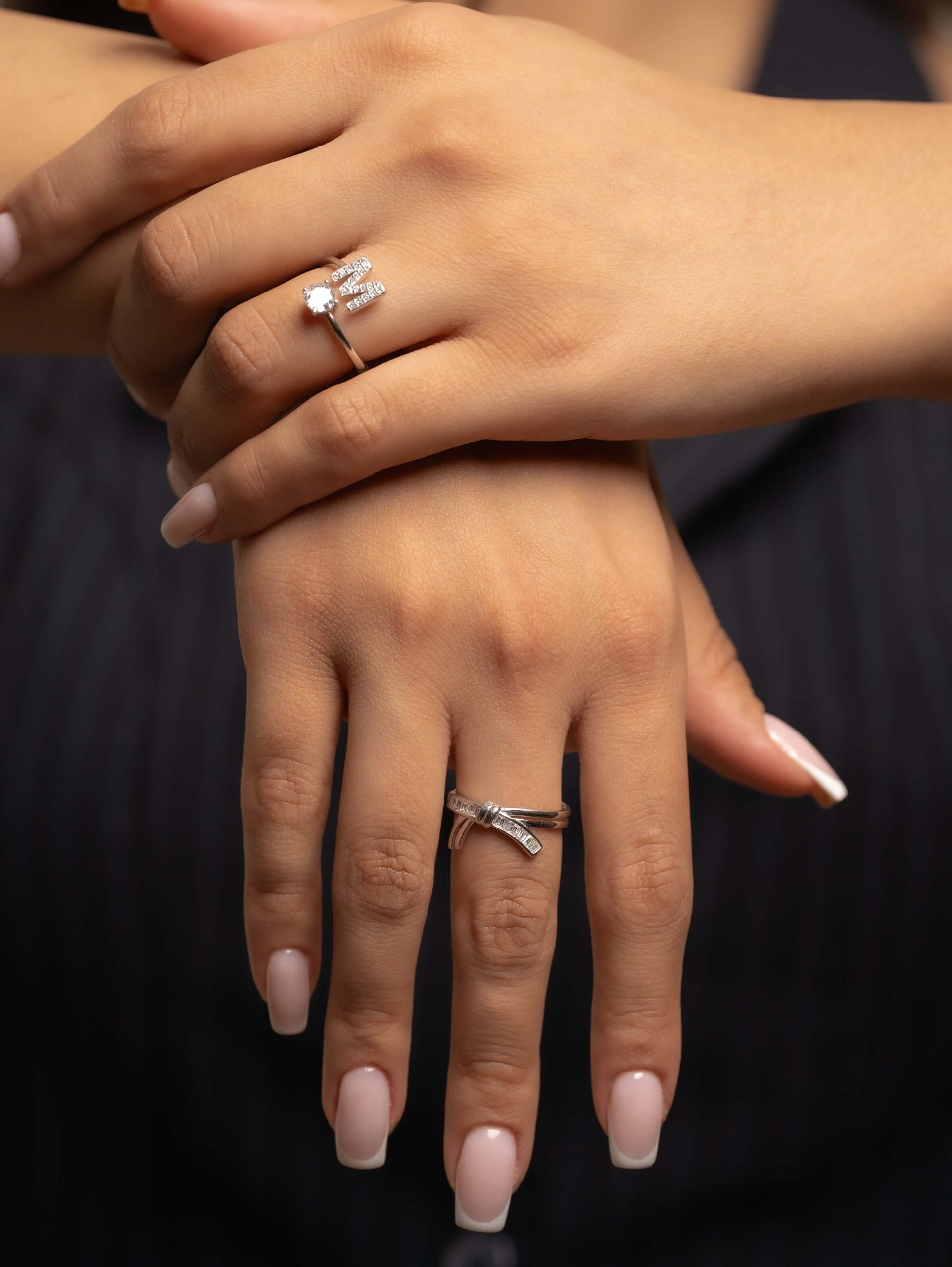 یکی از ویژگیهای برجسته طراحی این محصول، رکاب دو خطی آن است که در قسمت جلویی انگشتر به زیبایی به هم میپیوندند و گره پاپیون را تشکیل میدهند. این ساختار دو خطی باعث میشود انگشتر روی انگشت جلوهای عریضتر و پرکارتر داشته باشد، بدون اینکه احساس سنگینی ایجاد کند. داخل رکاب انگشتر، حک نماد S925 به چشم میخورد که نشاندهنده عیار استاندارد و اصالت نقره بهکاررفته در آن است. این انگشتر برای خانمهایی که به سبکهای مدرن و هندسی علاقه دارند و میخواهند استایلی متمایز از دیگران داشته باشند، انتخابی ایدهآل است.