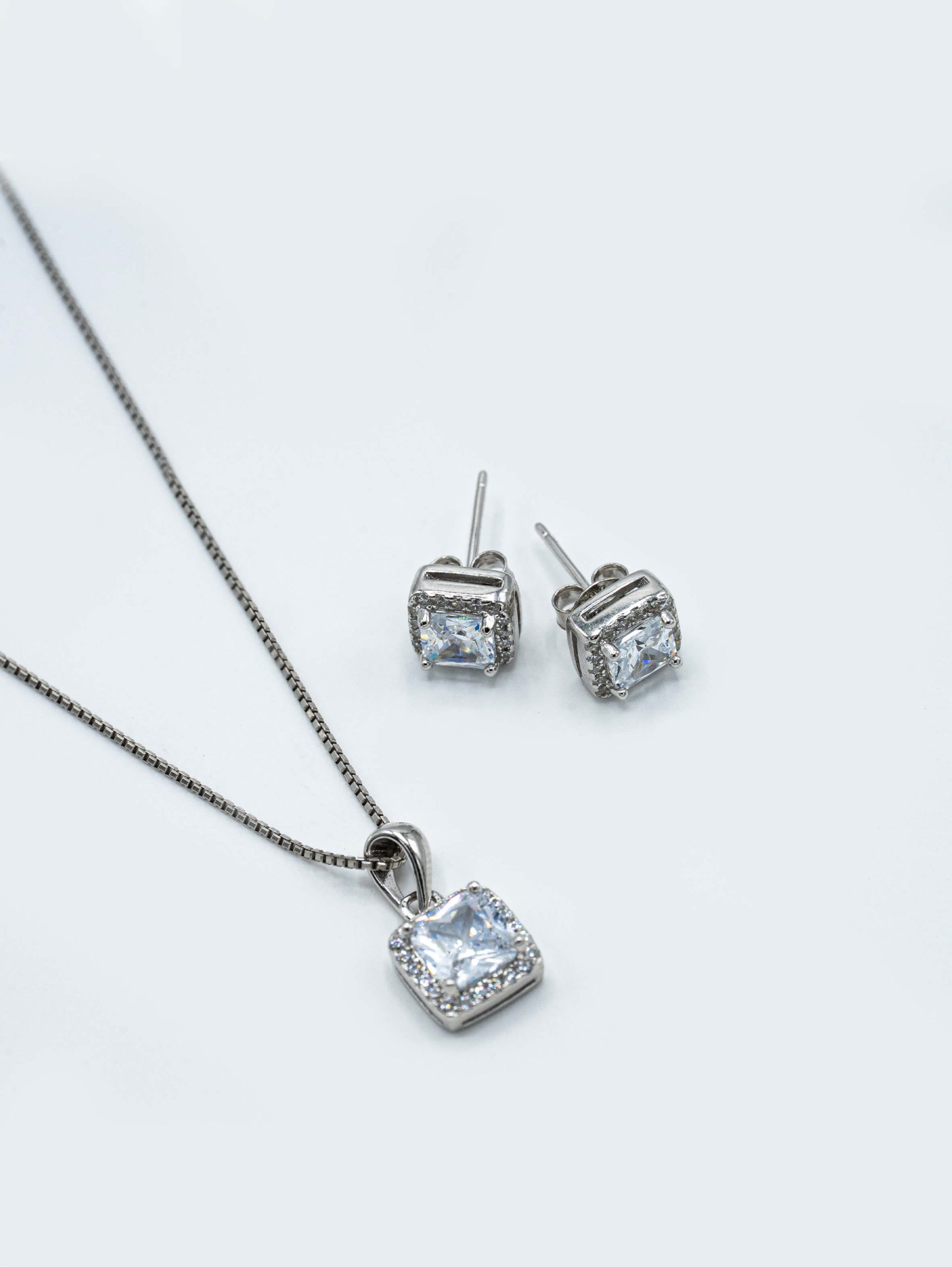 این نیم ست نقره زنانه، شامل یک گردنبند و یک جفت گوشواره میخی است که هر دو دارای طراحی «هاله» (Halo) هستند. در مرکز هر قطعه، یک نگین درخشان با «تراش مربعی» (Square Cut) یا پرنسسی قرار گرفته است. این تراش مدرن و هندسی، به دلیل صفحات متعدد خود، نور را به شکلی خیرهکننده بازتاب میدهد.